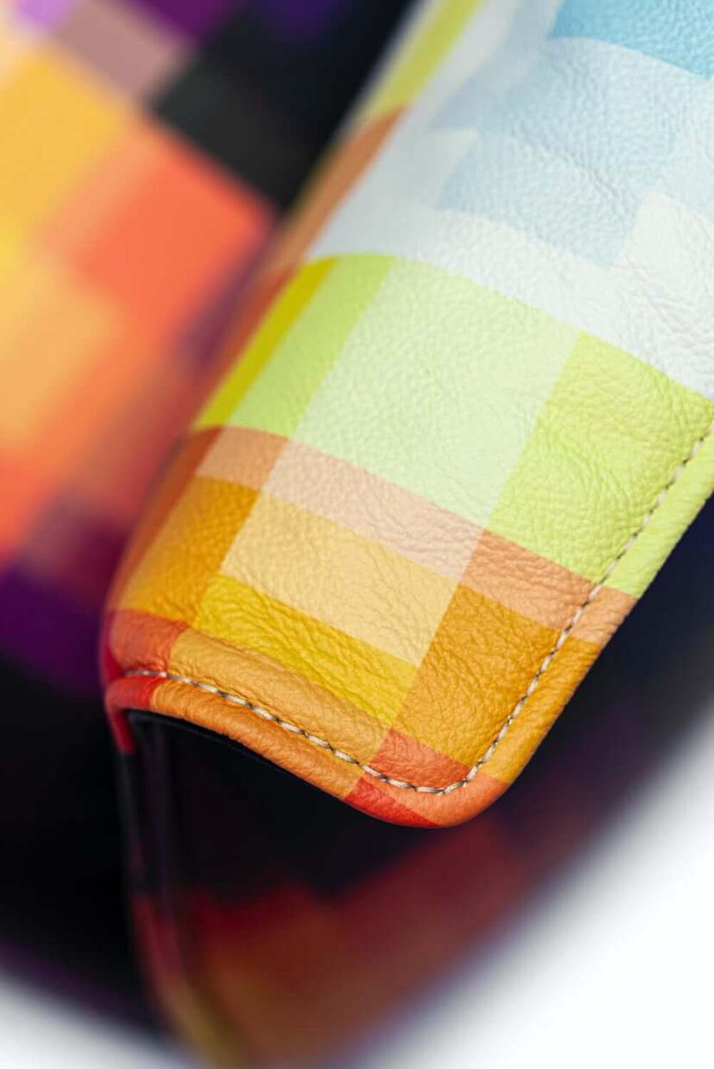 Le cuir Pelle Frau® pulvérisé une palette nuancée de rouges, d’oranges, de jaunes, de blancs et de bleus rappelant les températures d’une carte thermique. Le métal devient Multicolor Chrome : néancé, iridescent et changeant à la lumière