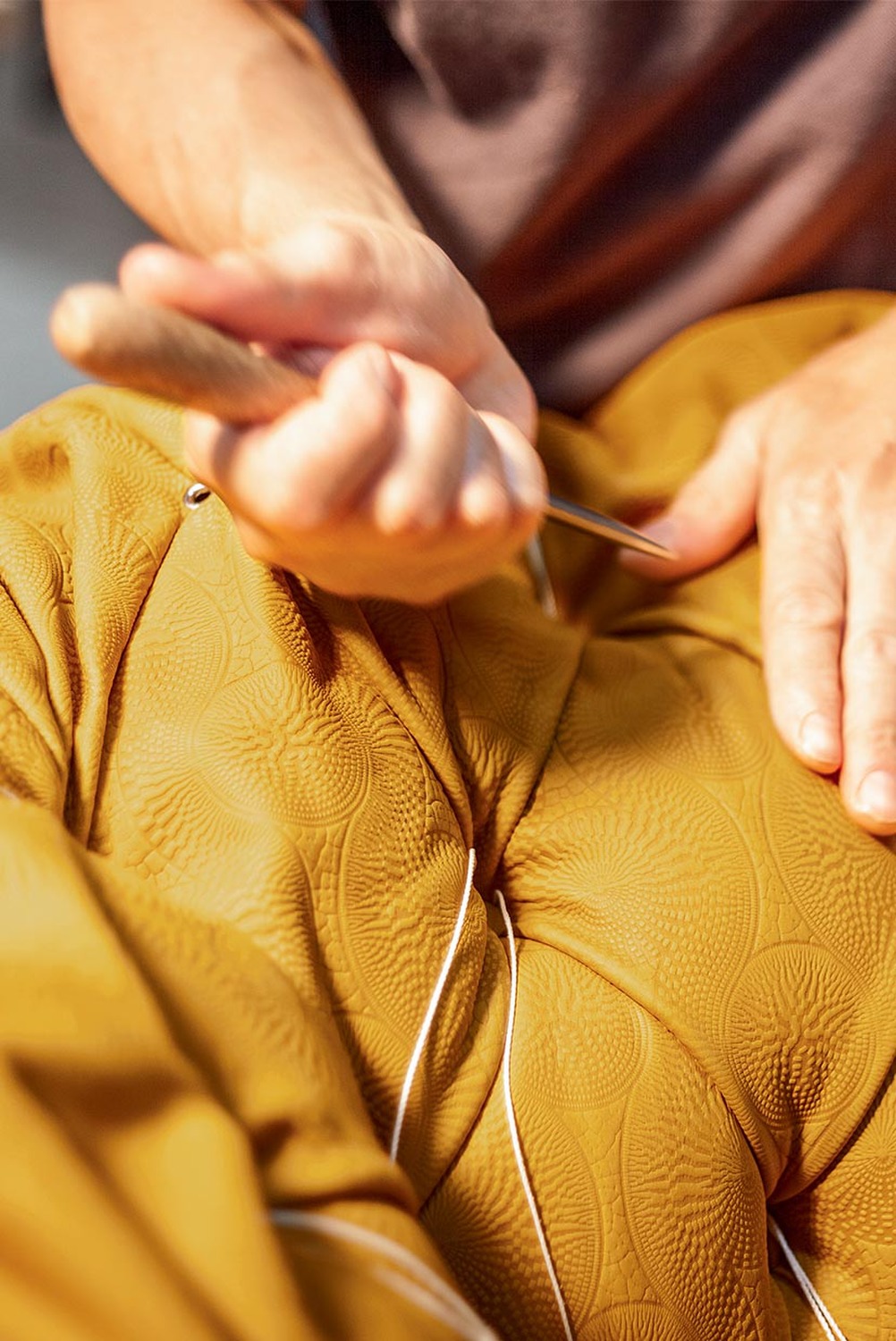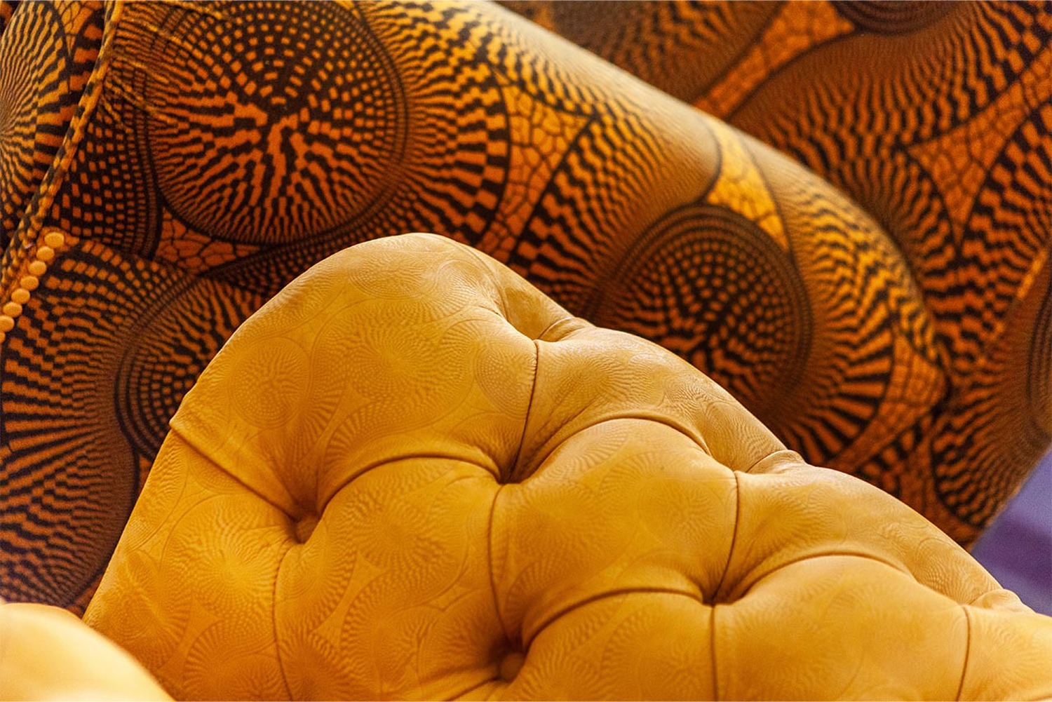 A new perspective in nubuck leather processing: the complex hand-embossing results in a highly textured and three-dimensional effect, enhanced by Boateng's choice of vibrant colors, specifically developed with Poltrona Frau to express the joy and energy of African culture with a contemporary twist.