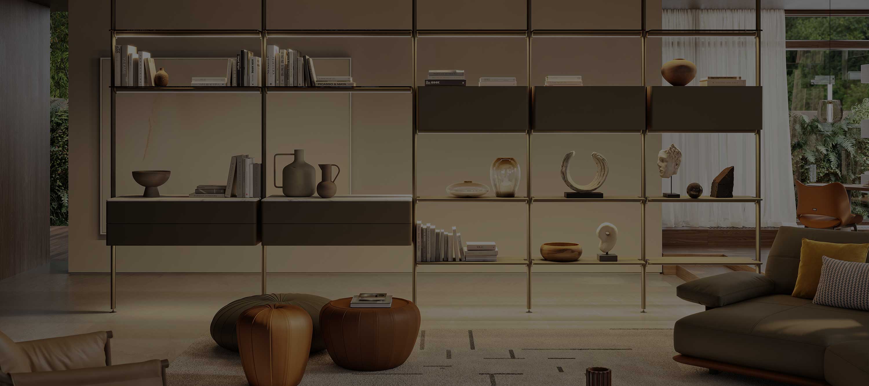 A light and rigorous architectural system that accommodates shelves and suspended storage units, configurable and accessible from both sides, designed to interpret space with continuity and design freedom.